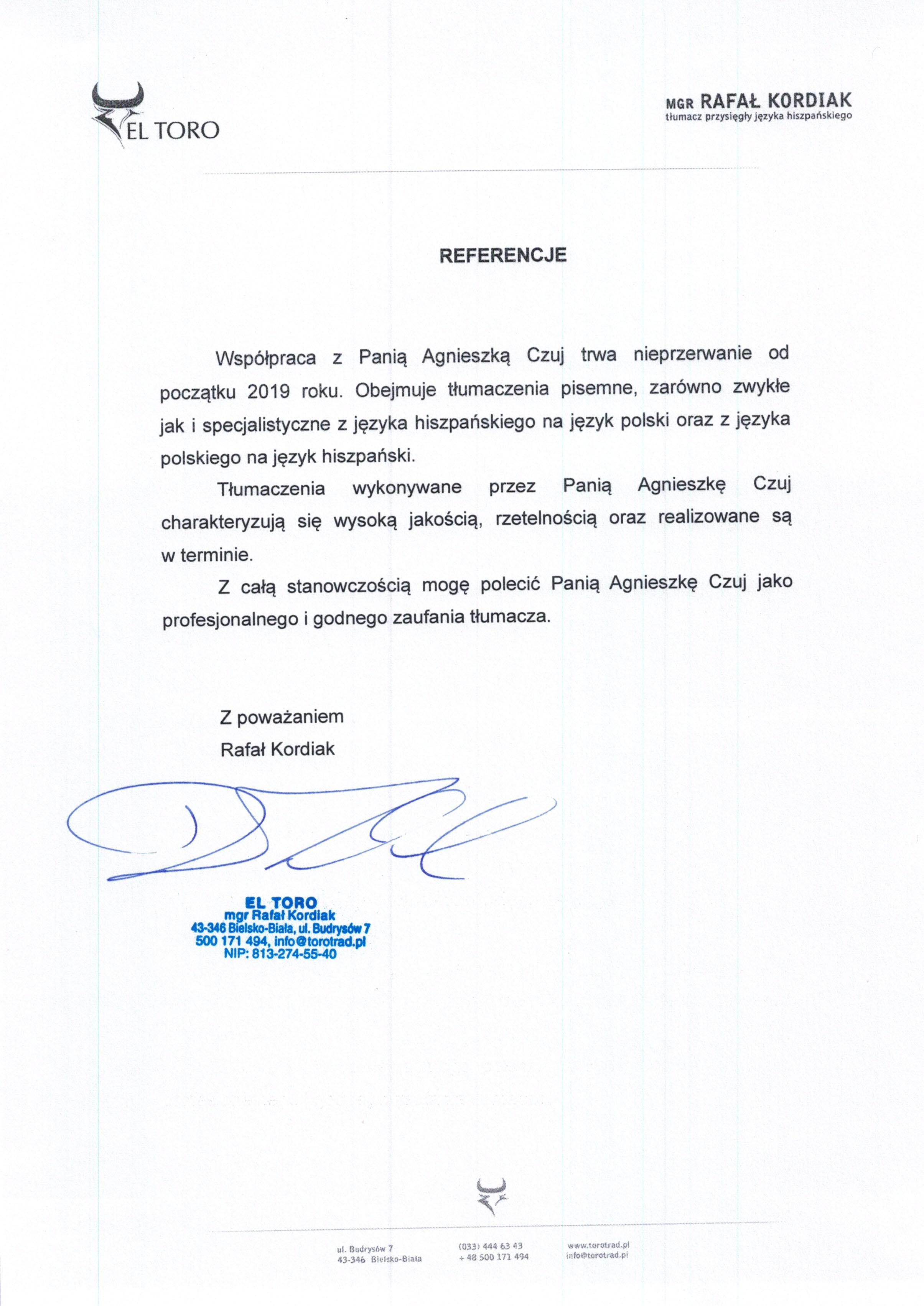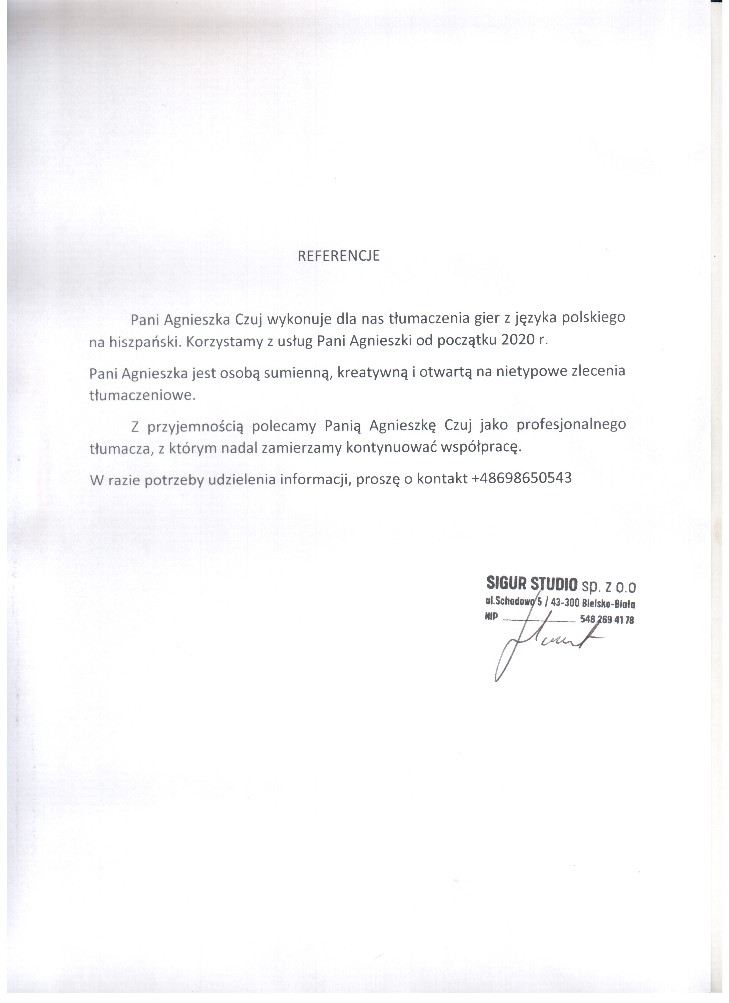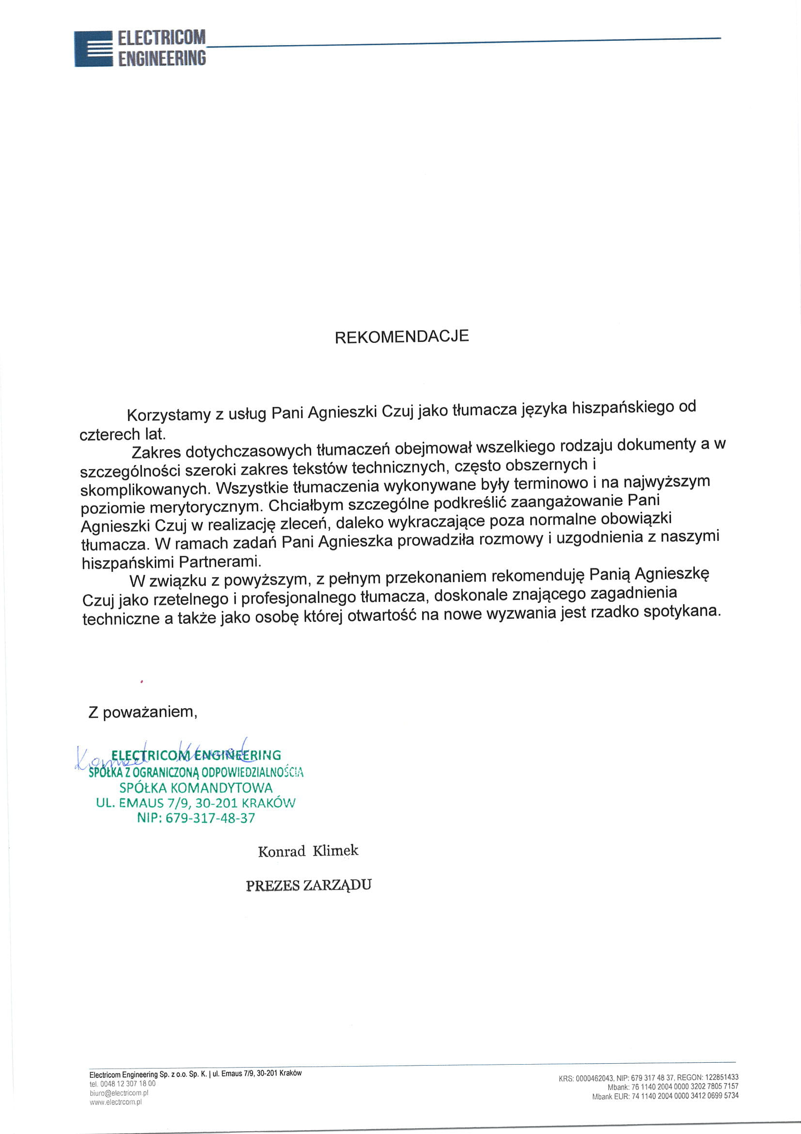 „Z pełnym przekonaniem rekomenduję Panią Agnieszkę Czuj jako rzetelnego i profesjonalnego tłumacza doskonale znającego zagadnienia techniczne, a także jako osobę, której otwartość na nowe wyzwania jest rzadko spotykana.”